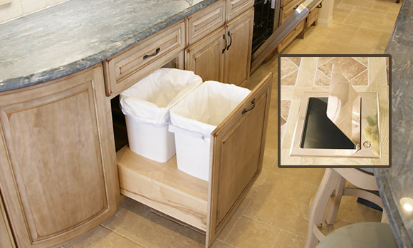 Putting your recycling bins and trash can on rollout shelves makes it a snap to sort items. Herbeau Creations of America, based in Naples, Fla., even makes a push-button rubbish chute that can be installed on a kitchen counter or on a wall. The $1,300 chute is 10 by 10 inches and keeps your kitchen tidy by funneling items into a trash can or composting bin.