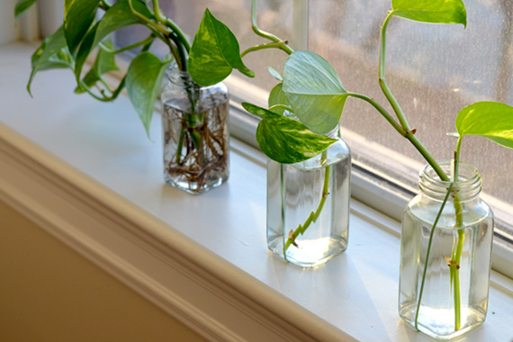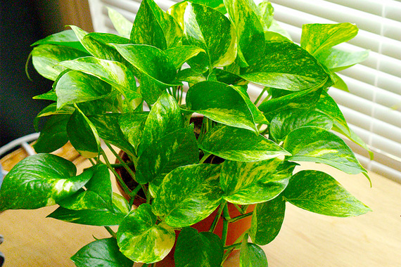 Golden pothos is a vine with broad, heart-shaped leaves. It’s commonly grown in hanging baskets so it can trail its long, graceful stems. It’s one of the easiest houseplants to grow and and tolerates lots of differing conditions. It’s good at removing a variety of household chemical vapors including formaldehyde — a common indoor air toxin that’s released by floor coverings, fabrics, adhesives, and building materials.