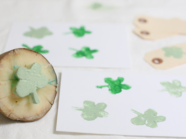 Dip the potato in ink and your kids will have fun stamping St Patrick’s Day cards. The less ink the better.