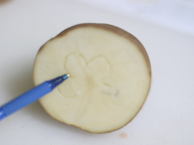 Once the initial shape has been made, reinforce deeper with the pen and then start to carefully cut around the shape with the knife. You’ll want to leave the clover sticking out in the middle and remove the potato from the sides around it.