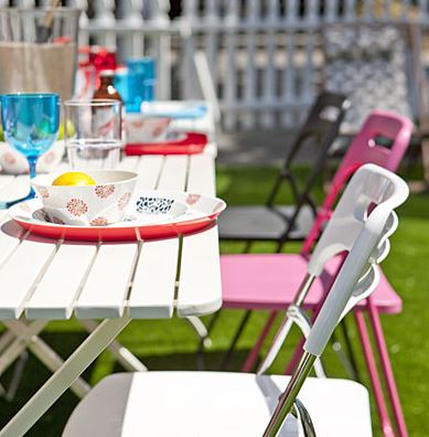 Colorful melamine plates from Ikea make it fun to set the table. Plastic glasses are sturdy enough for the dishwasher and reuse all summer. Plastic folding chairs pack away when not needed.