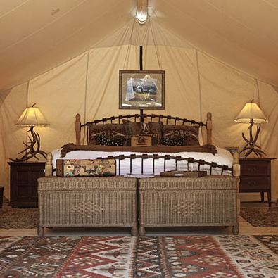 We borrowed this luxury tent from The Resort at Paws Up in Greenough, MT, where “roughing it” means canvas platform tents with oil paintings hanging above feather beds, terry-cloth robes as fluffy as Big Sky Country clouds, and elk-antler bedside lamps.