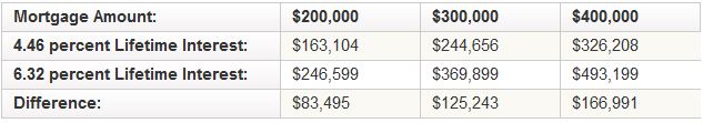 He adds that it’s only natural that most people pay more attention to the monthly payment, because that’s how we all budget our incomes. But he advises people to look at the lifetime interest cost too. And when they do, one thing sticks out: seemingly small changes in the interest rate can have major affects on the lifetime cost of your home.