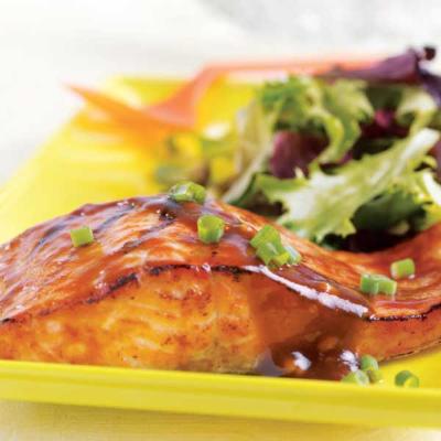 - Cook on a well-oiled grill for about 5 minutes on each side or until salmon is cooked to your liking, brushing with half the sauce during the last few minutes of grilling. Remove from grill and pour remaining sauce over top. Garnish with snipped green onion tops.