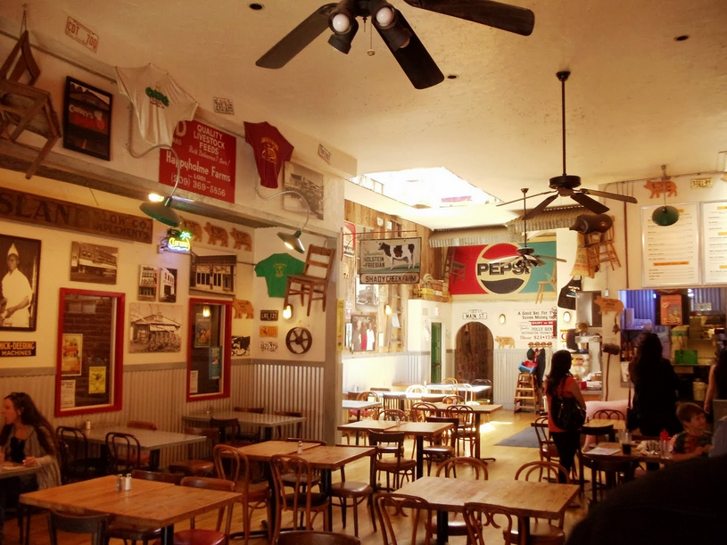License plates, road signs and all thing American adorn the fence-walls of Smokin’ Mo’s backyard patio. Stacked wooden barrels form a water feature and the sound alone is enough to cool you off on a hot August night. With brick walls, climbing vines and delicious BBQ at picnic tables, this is the perfect setting for a family night out.