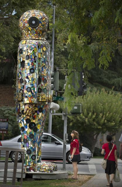 In a collaboration with Monto Kumagai, an area software developer, and a bunch of artists who donated their time and talents, Natsoulas last year unveiled the Davis Transmedia Art Walk. The path loops around downtown and parts of the UC Davis campus, and features more than 50 pieces of art. Works of art – such realistic murals, abstract sculptures, a mosaic bench in the shape of a dog – are embedded with radio-frequency-identification technology chips, which viewers can wave their smartphones over to see multimedia extras about the piece and its creator. Natsoulas toiled for years to bring public art – and the ability to share experiences both face-to-face and through technology – to Davis.