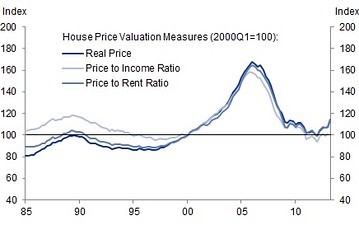 First, housing is no longer that cheap. Home prices relative to incomes and relative to rents no longer look “undervalued” as they did over the past two years. Instead, recent home-price gains have put home prices on a national basis back close to “fair value.”