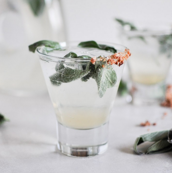 On a plate, combine bacon and salt, mixing well to combine. Take your glass and rub a drop of honey on 1/4 of the rim, then dip, twist and turn it around in the bacon salt, coating it. I don’t recommend coating more than 1/4 of 1/3 of the rim because it will overpower the honey sage. If you cannot find smoked sea salt, regular can be used in place of it. If you are vegetarian or prefer not to use bacon, the salt is just fine too.