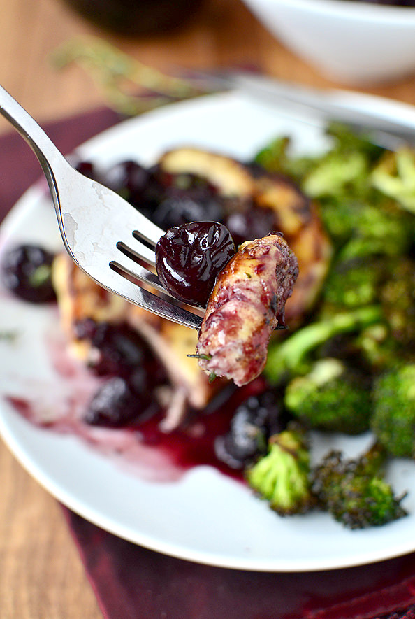 - Melt 1 Tablespoon butter in same skillet then add shallots and saute until tender, 2 minutes. Add wine, chicken broth, balsamic vinegar, and fresh cherries, if using, then simmer until sauce is reduced by nearly half, 3-4 minutes. If using frozen cherries, add now with thyme then continue to reduce sauce until slightly thickened, 2-3 minutes, pressing down on cherries gently with the back of a wooden spoon.
