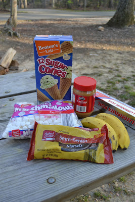 2. Spread some peanut butter on the inside of the cone, then put in the bananas, marshmallows and chocolate chips.