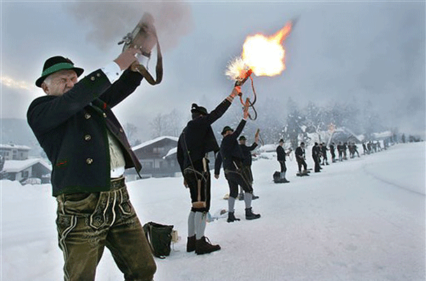 In acknowledgement of the Christmas Holidays, Bavarian Highlanders fire handheld mortars into the air every year while wearing their traditional dress.