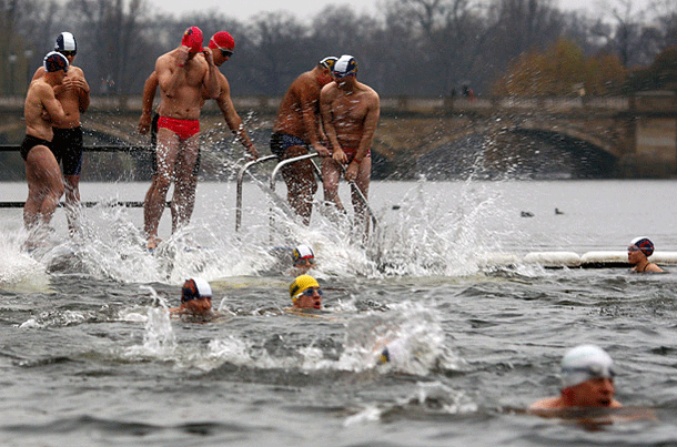 Every December a group of competitors congregates on the shore of Serpentine Lake in London as they get ready to take part in a 100 yard race through the freezing water.