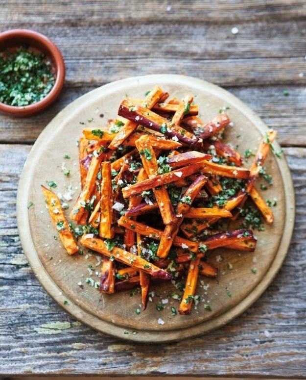 Anyone who likes classic French fries is guaranteed to like these cheese-and-herb-dusted sweet potato fries. They are roasted rather than deep-fried, which makes them healthier without sacrificing flavor. Leaving the peel on adds more taste and texture to the dish and also retains more nutrients.