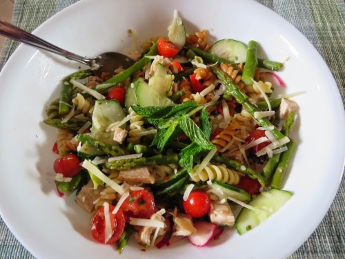 1. Cook pasta according to package directions for al dente. Add chicken and next 3 ingredients, and cook, stirring often, 1 minute. Drain and place in a large bowl.