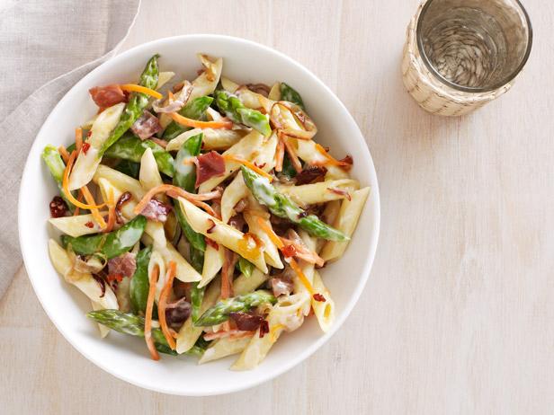 - Bring a pot of water to a boil, salt it generously and cook the pasta for 8 minutes; add the asparagus, carrot and snap peas and cook for 3 minutes. Check the pasta and vegetables to make sure they’re cooked through but still have texture, then drain.