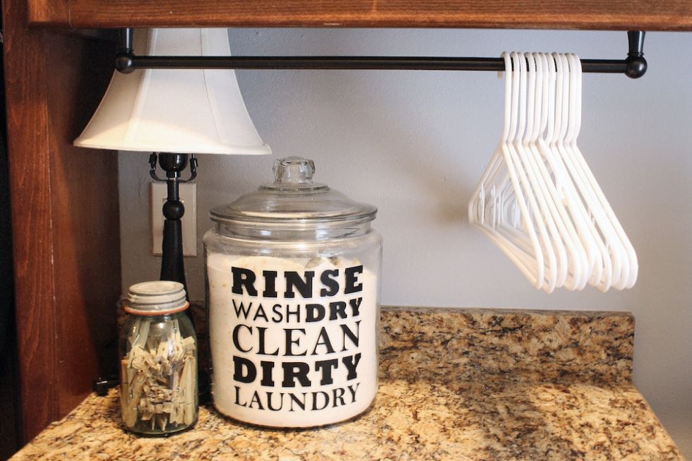 Flipped under a cabinet, a towel bar keeps hangers within easy reach for hang drying clothes coming out of the washer.