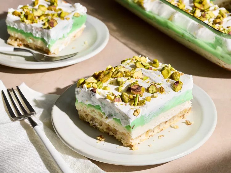 - Spread remaining whipped topping over the pudding layer. Top with pistachios, or top with pistachios just before serving.