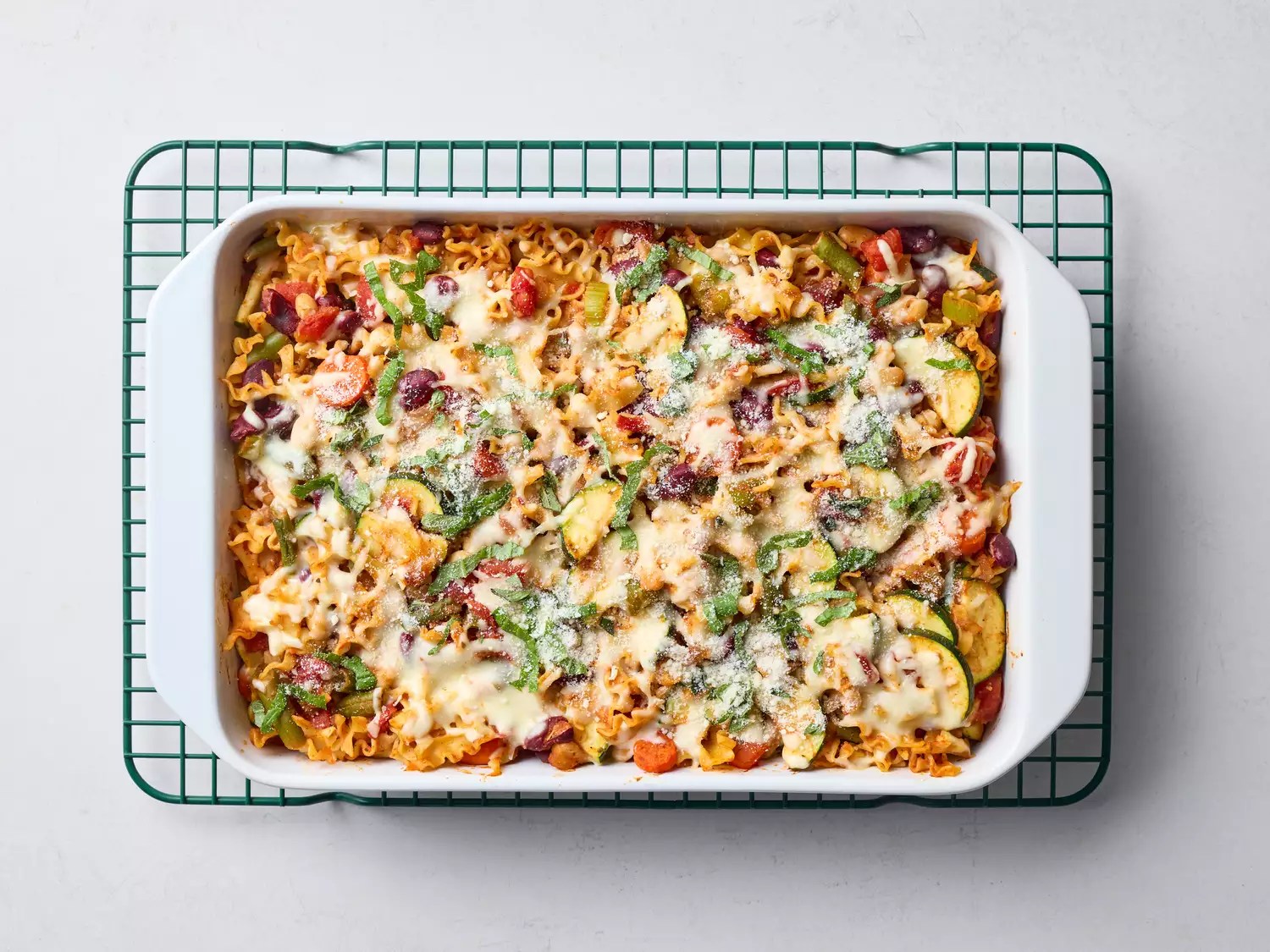 - Add carrot mixture, beans, tomatoes, green beans, tomato sauce, 1/4 cup Parmesan cheese, Italian seasoning, salt, and pepper to the bowl of pasta. Stir well to combine. Transfer pasta mixture to the prepared dish and cover with foil.