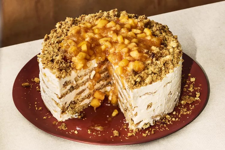 Repeat layering process 3 times with cookies, bourbon, whipped cream mixture, and remaining diced peach mixture. Top cake with a final layer of cookies, and brush with remaining about 1 1/2 teaspoons bourbon. Spread remaining about 1 cup whipped cream mixture evenly over cookies. Cover with plastic wrap, and refrigerate at least 4 hours or up to 12 hours.