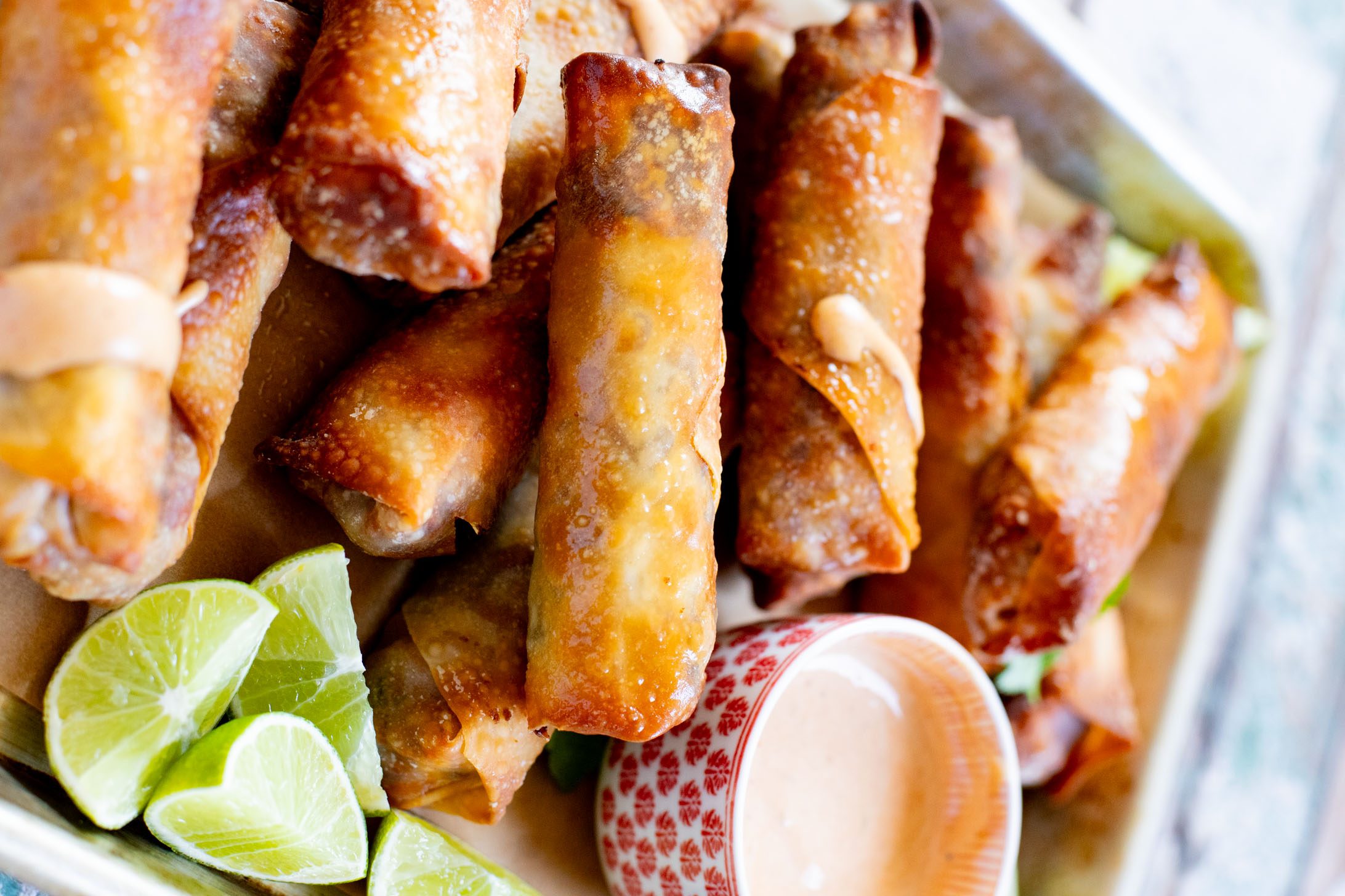 - To assemble, add 3 tablespoons of the mixture to each wrapper. Brush the edges of the wrapper with water and roll up (like a burrito). Place on the baking sheet. Spray the rolls with oil and place in the oven for 10 minutes. Flip and cook for another 10 minutes (see notes for air fryer instructions).