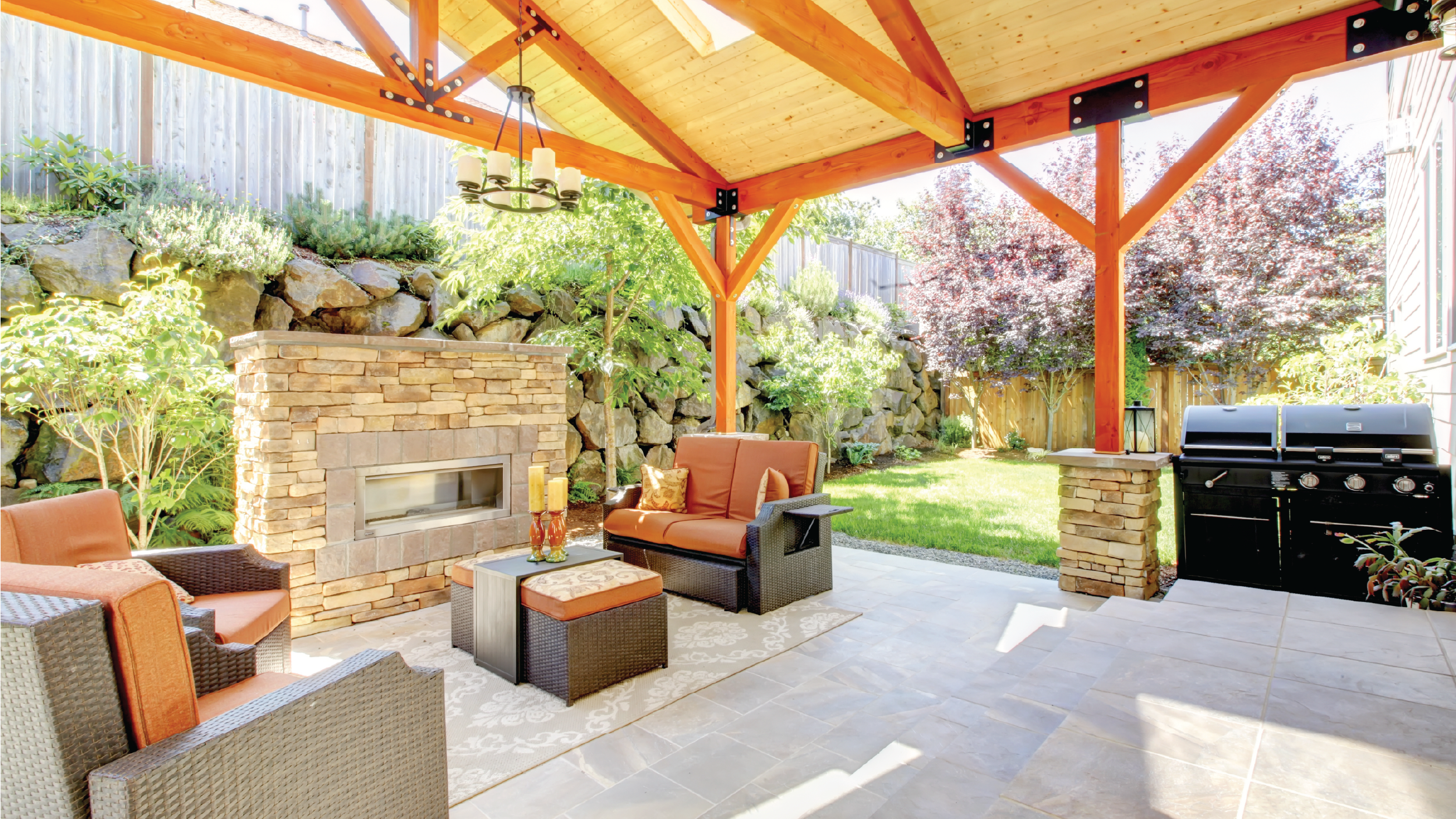 Comfort should no longer be an afterthought when creating an welcoming outdoor space. Shade structures, ceiling fans and even misting systems to help cool people down during the summer can be great additions to your outdoor space and create a relaxing area for guests.